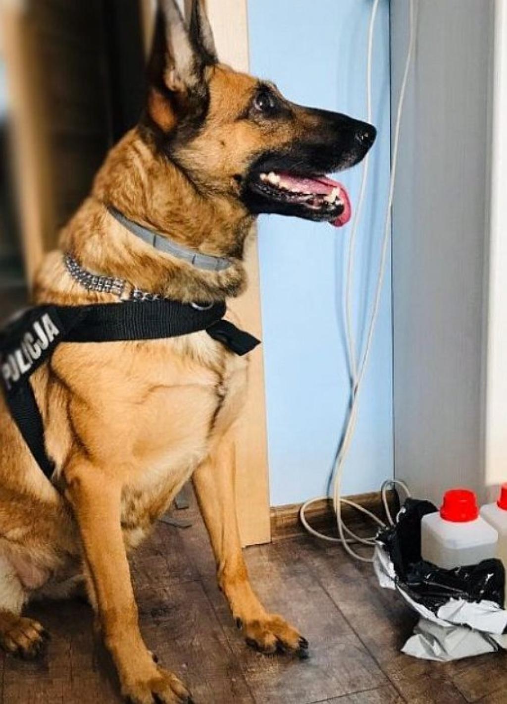 W trakcie przeszukania w jednej z sypialnianych szafek policjanci znaleźli i zabezpieczyli 9 plastikowych pojemników wypełnionych podejrzanym płynem. Do działań został także wykorzystany pies specjalnie wyszkolony w wykrywaniu zapachów narkotyków. To właśnie czuły nos czworonoga doprowadził policjantów do miejsc, gdzie ukryte były woreczki z marihuaną oraz grzyby halucynogenne. Ze wstępnych ustaleń wynika, że zabezpieczone substancje to blisko 13 litrów płynu GBL, z którego można byłoby przygotować około 13 tysięcy działek dealerskich o wartości kilkunastu tysięcy złotych. Zabezpieczony materiał został przekazany do dalszych badań laboratoryjnych.