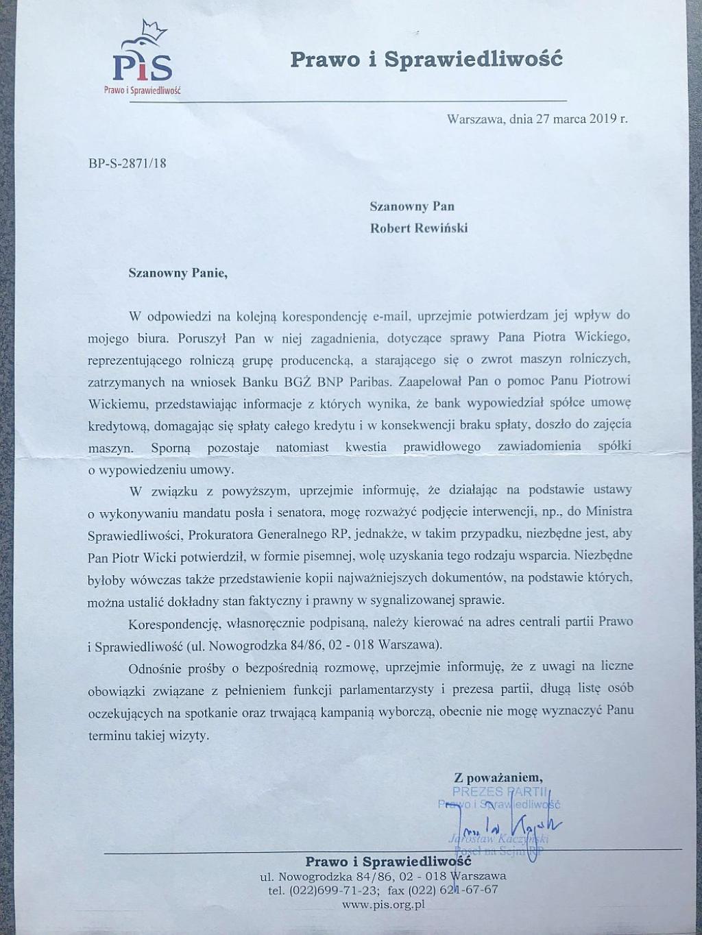 Całą sprawą zainteresował się Prezes Prawa i Sprawiedliwości Jarosław Kaczyński, do którego zwróciliśmy się z prośbą o interwencje w sprawie bezradności polskich rolników w relacji z BGŻ BNP PARIBAS. O sprawie pisaliśmy w artykule: